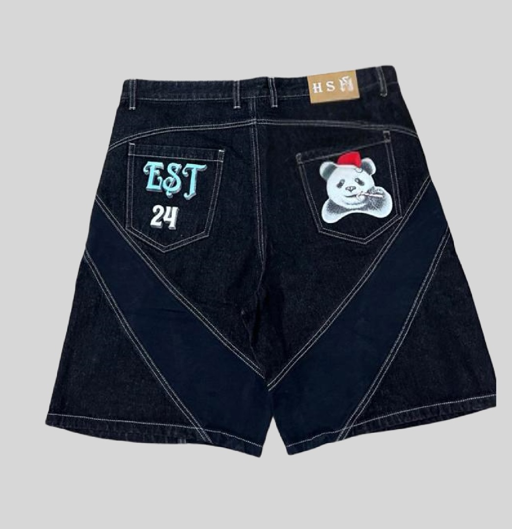 These straight denim shorts are made from 80% cotton, offering a breathable and casual street style. The custom washed finish enhances their laid-back vibe. Embroidered on the front left pocket is the Hood Savants name, complemented by a whimsical festive panda 🐼 design on both the front and back pockets, adding a fun touch to your summer wardrobe.